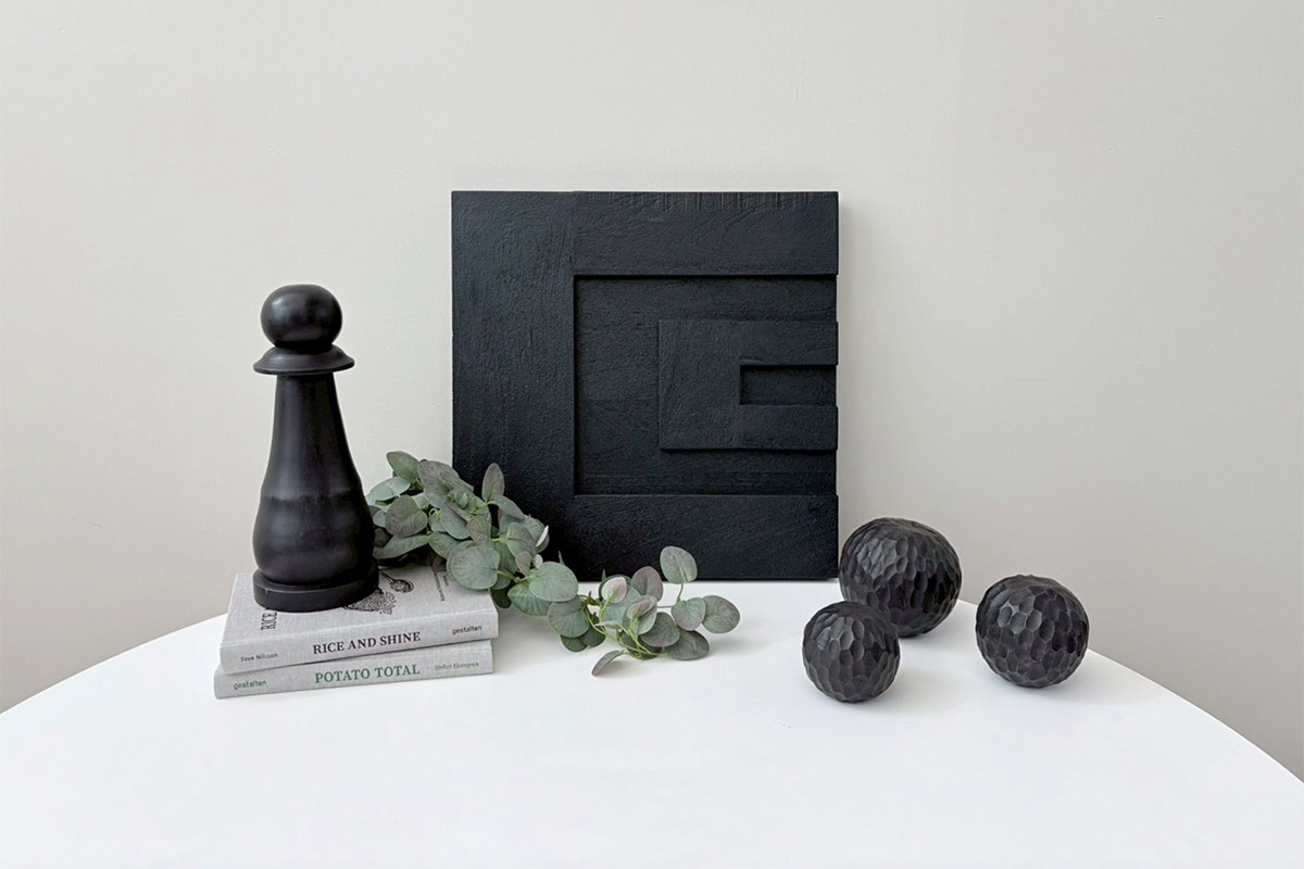 丸みを帯びたフォルムが木のぬくもりを引き立て、シックなブラックカラーながら穏やかさも感じられます。本や花と組み合わせて飾ると、上品な雰囲気のコーディネートに。
