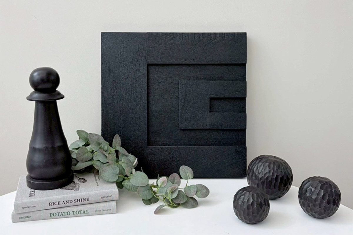 中心のウォールアートはマンゴーの木材を使用してつくられた、幾何学的なレリーフアートです。黒の中に木目の表情がさりげなく残り、無機質になりすぎない柔らかさが魅力です。