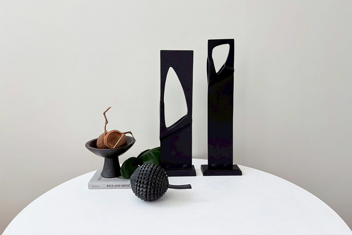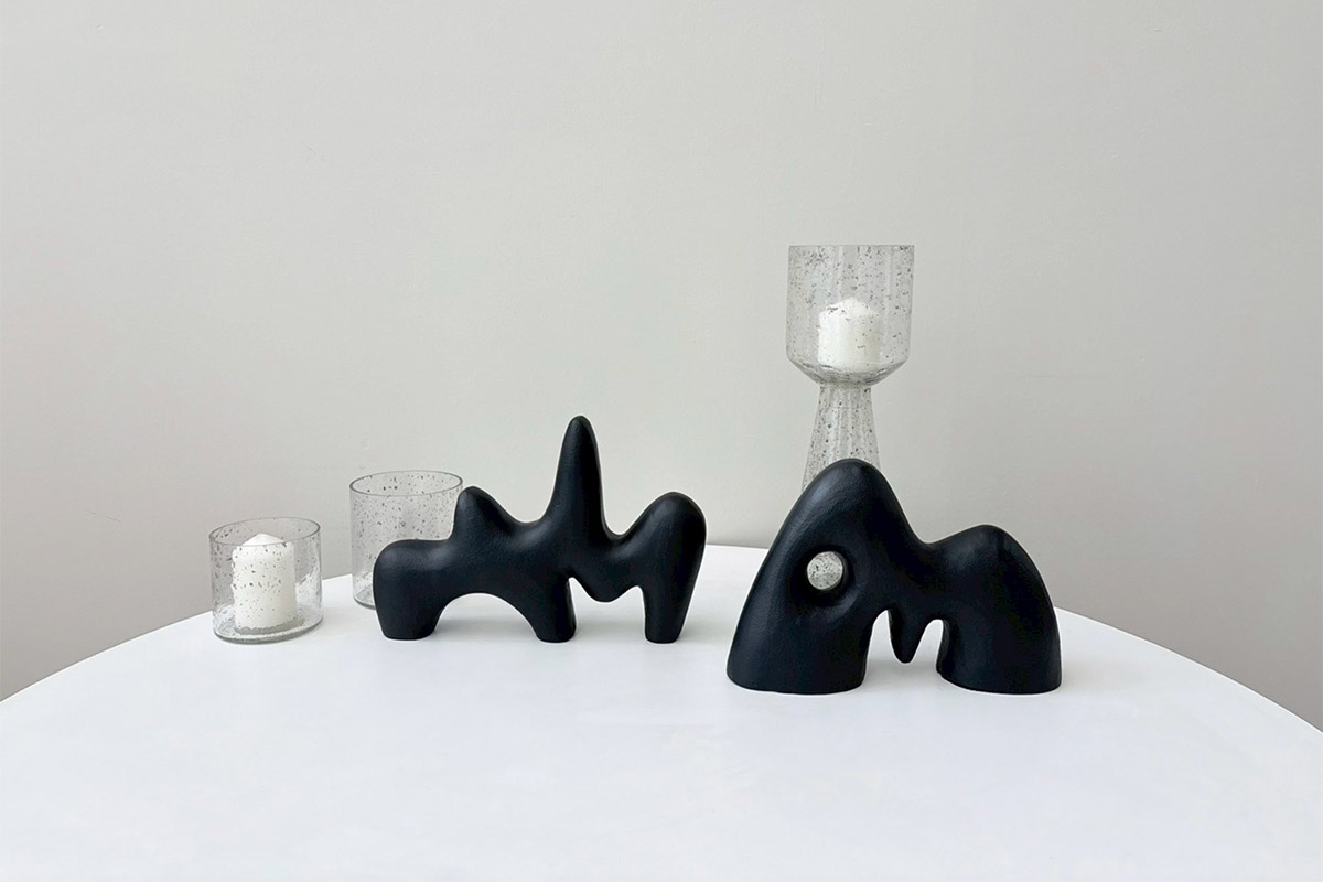 中央のスタンドオブジェはシャープなシルエットながら、どこか柔らかさを感じる佇まいが印象的です。