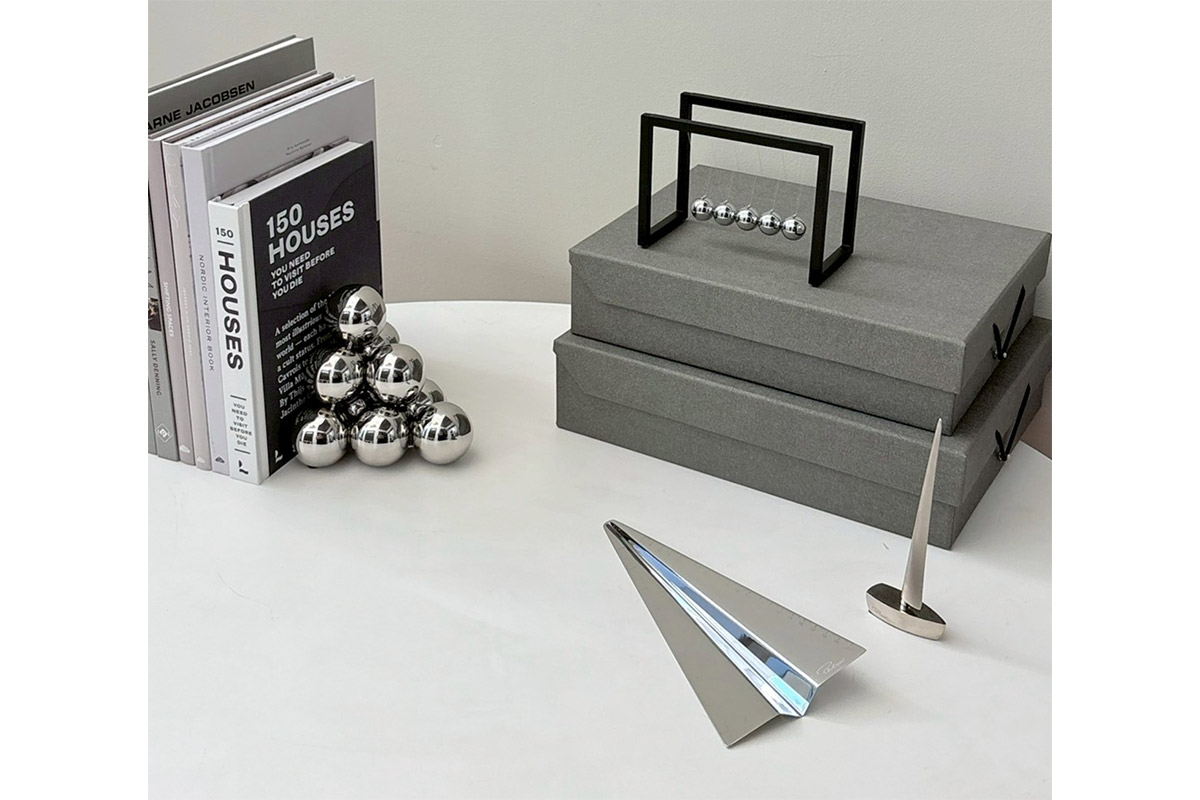 ボックスの上にあるのは、ニュートンのゆりかごをモチーフにしたバランスボール。ブラックフレームとシルバーの球体が織りなすコントラストがスタイリッシュで、空間に洗練された表情を添えます。