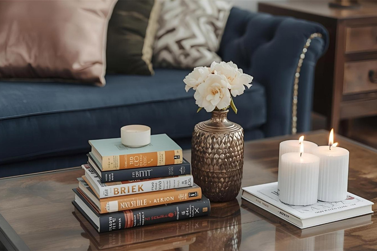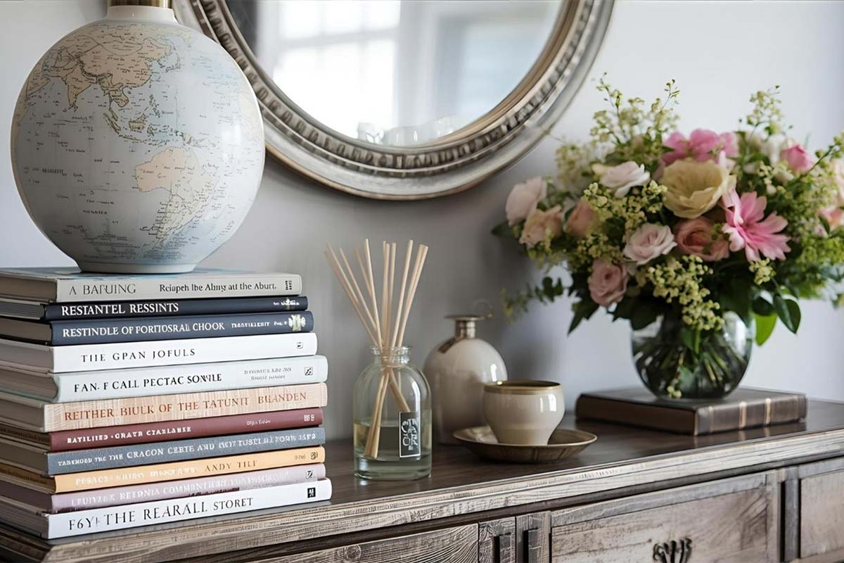 たとえばコンソールテーブルの上に洋書を重ね、香りのディフューザーや小さな花瓶を添えると、上品な「迎え入れる空間」に。