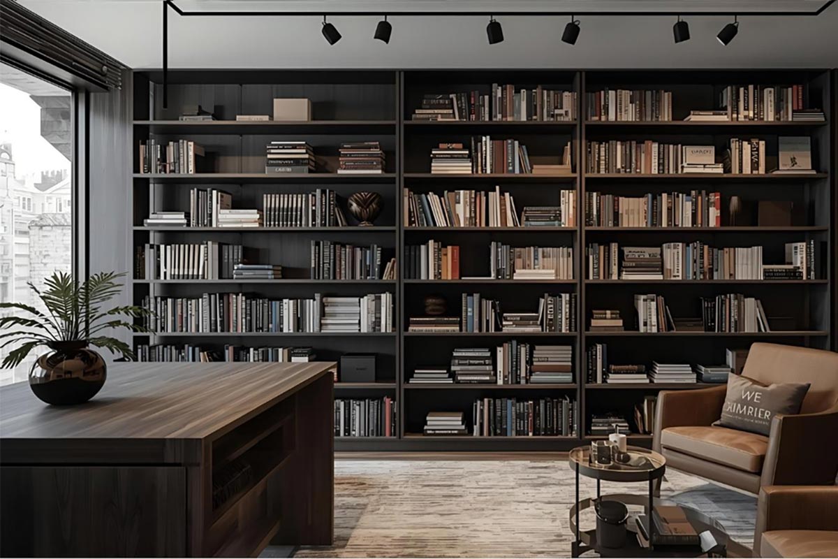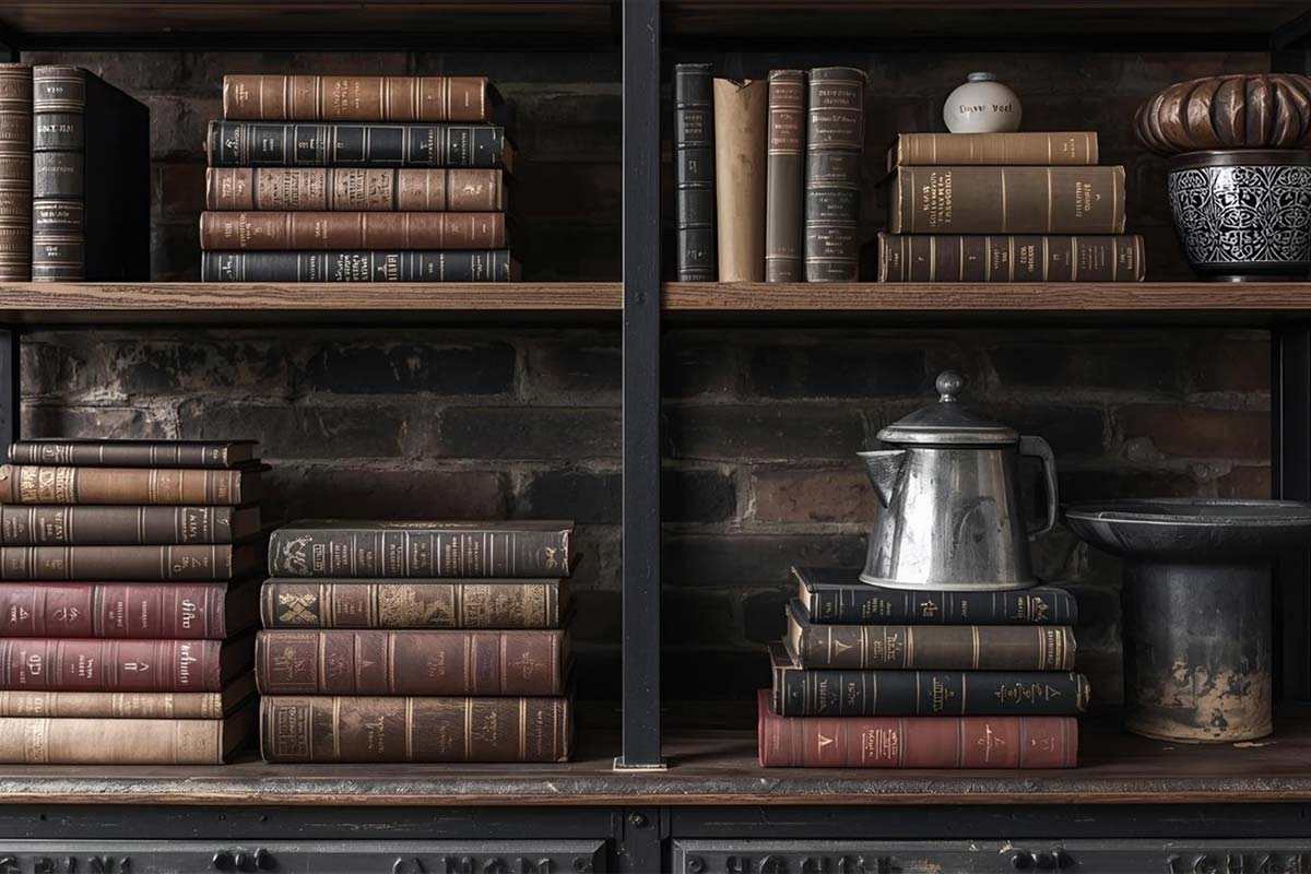 このスタイルに合わせるなら、金文字や厚みのある背表紙をもつ洋書がぴったりです。装丁にクラシカルなデザインが施されたものや、革表紙の洋書を選ぶと、インテリアの格が一段と上がります。