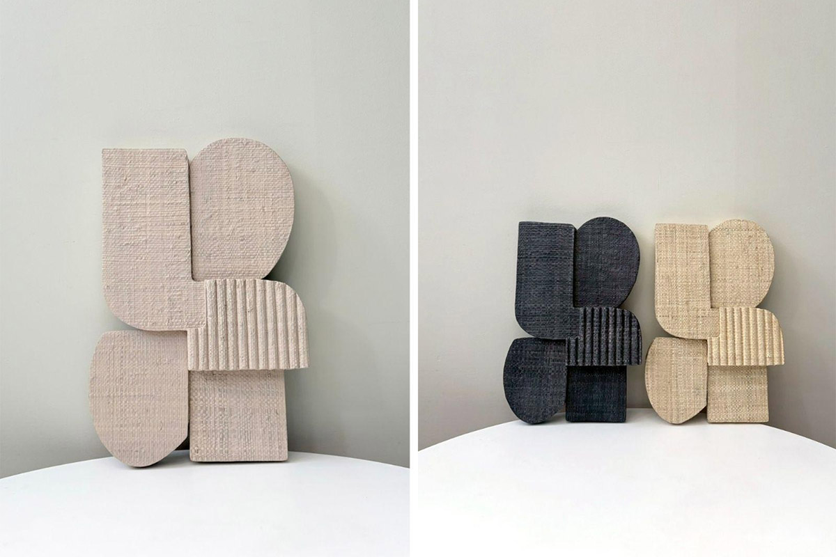 中央のオブジェはヤシを編み込んだ生地で表面が覆われており、自然の息遣いを感じられる作品です。