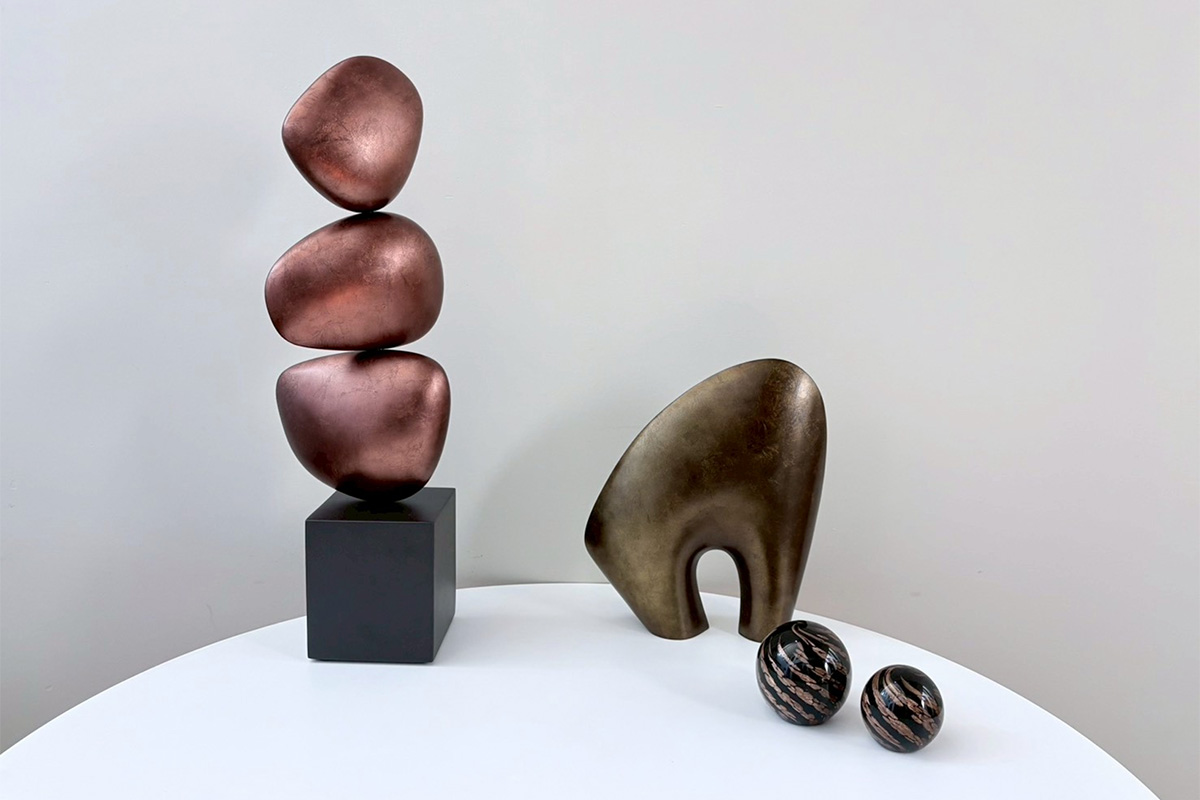 左の積み重なるようなフォルムのオブジェは、高さがあり存在感のある一品です。目を惹きつける印象的なアイテムでありつつも、マットなブロンズカラーが落ち着いた印象も与えるため、どのような空間にも自然と馴染みます。