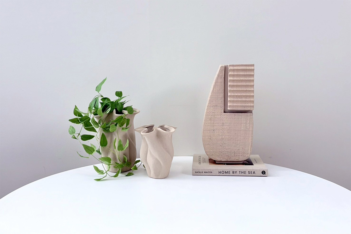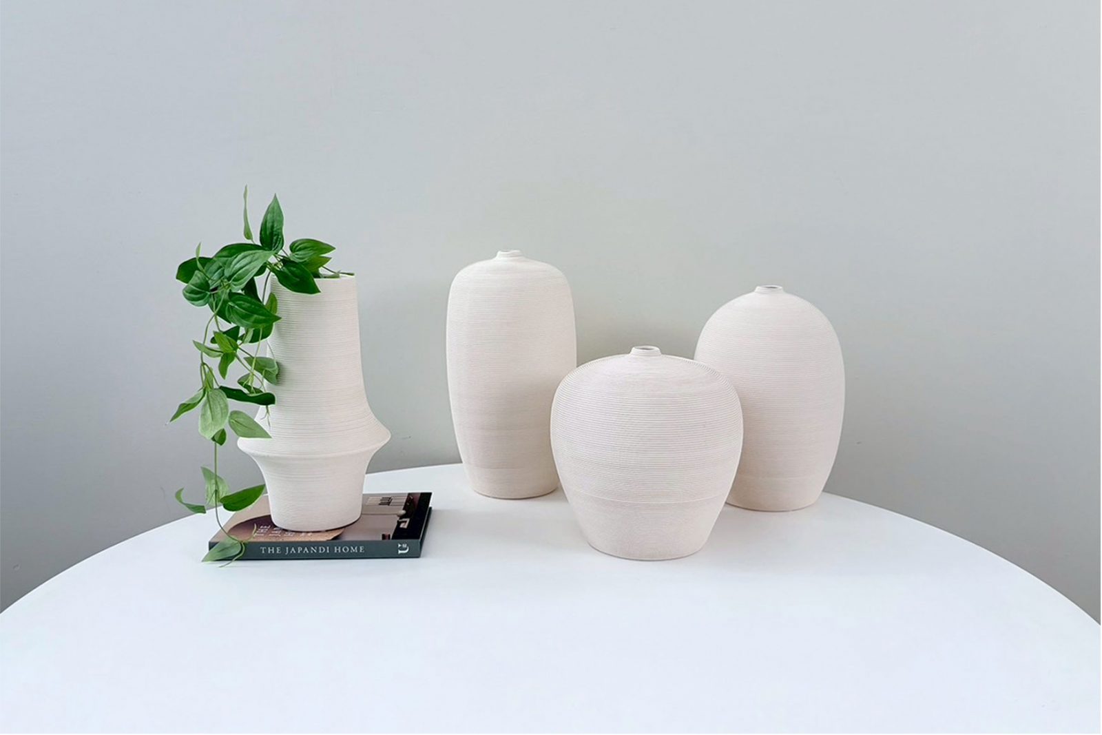 右側の楕円型フォルムのベースは3サイズご用意があるため、高さを変えながら並べることで、棚やカウンターに広がりを持たせた設えが可能です。