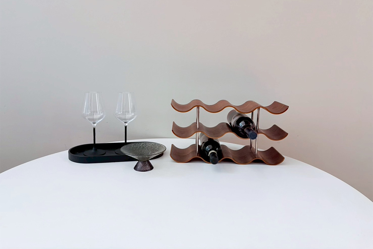 こちらは波を連想させる曲線のシェルフが印象的なワインラックです。